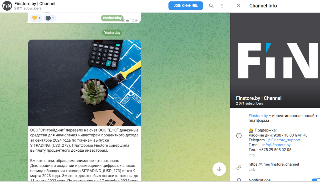 Официальная платформа проекта — finstore.by. Она представлена на русском языке. Здесь основатели презентуют компанию, как часть банковского холдинга ОАО Банк БелВЭБ. Организация специализируется на цифровых облигациях (токенах). Оператором выступает ООО ДФС.