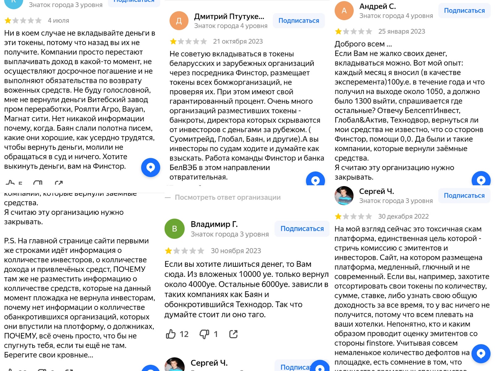 На сторонних ресурсах встречаются разные отзывы клиентов о компании Finstore by, которая находится по адресу Минск ул Мясникова 70. В негативных откликах клиенты жалуются на то, что проект сотрудничает с сомнительными организациями и средства инвесторам не выплачивают.