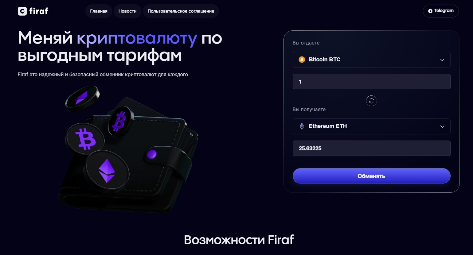 Firaf – безопасный обменник криптовалют, функционал которого адаптирован под любого клиента, вне зависимости от его опыта в области цифровых активов. Платформа поддерживает множество популярных криптовалют: Bitcoin, Ethereum, Tether Dogecoin, Ethereum и другие. Firaf обещает своим пользователям выгодные курсы обмена, отобранные среди лучших предложений на рынке.