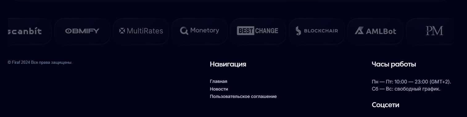 Firaf утверждают, что их платформа безопасна и защищает данные клиента, однако, никаких гарантий этого нет. Мы не можем рекомендовать этот обменник, потому что: