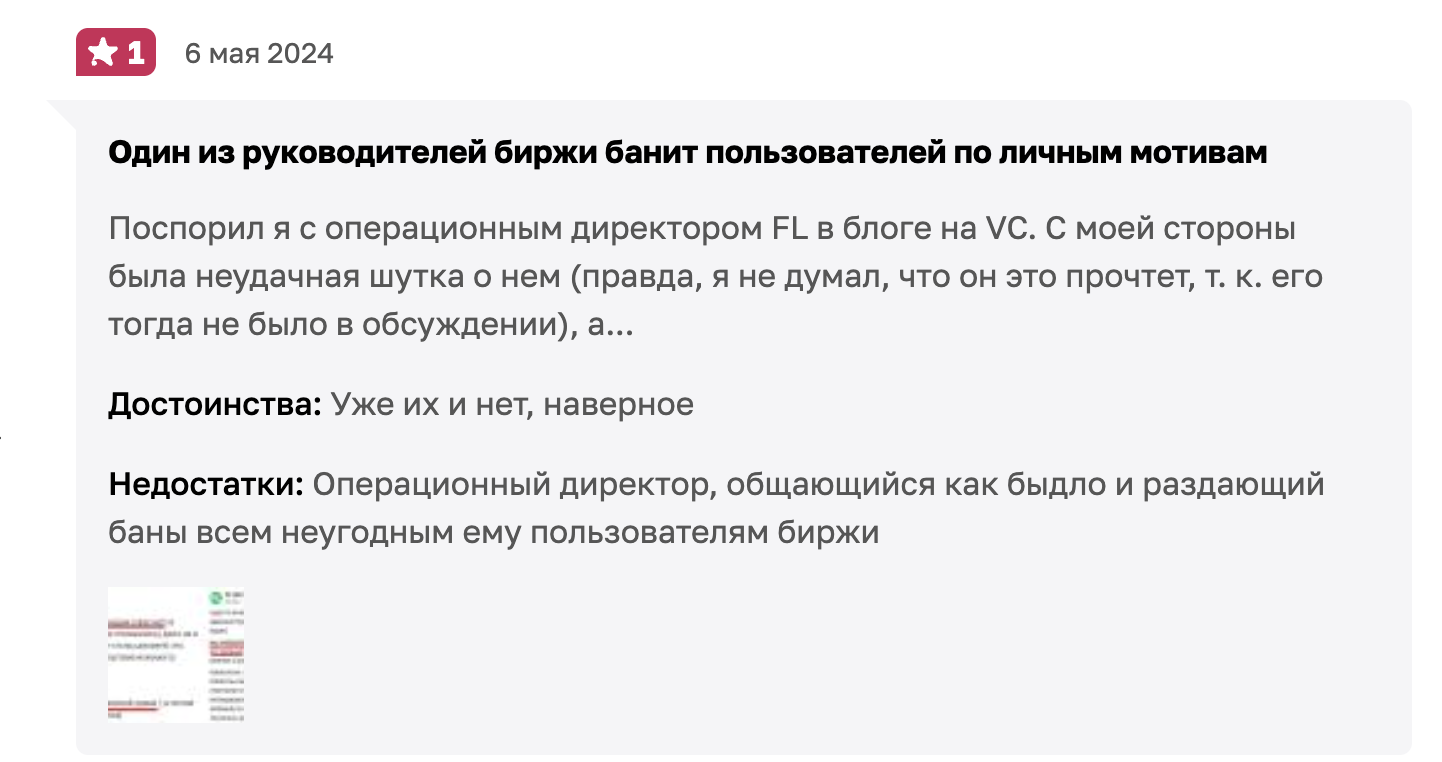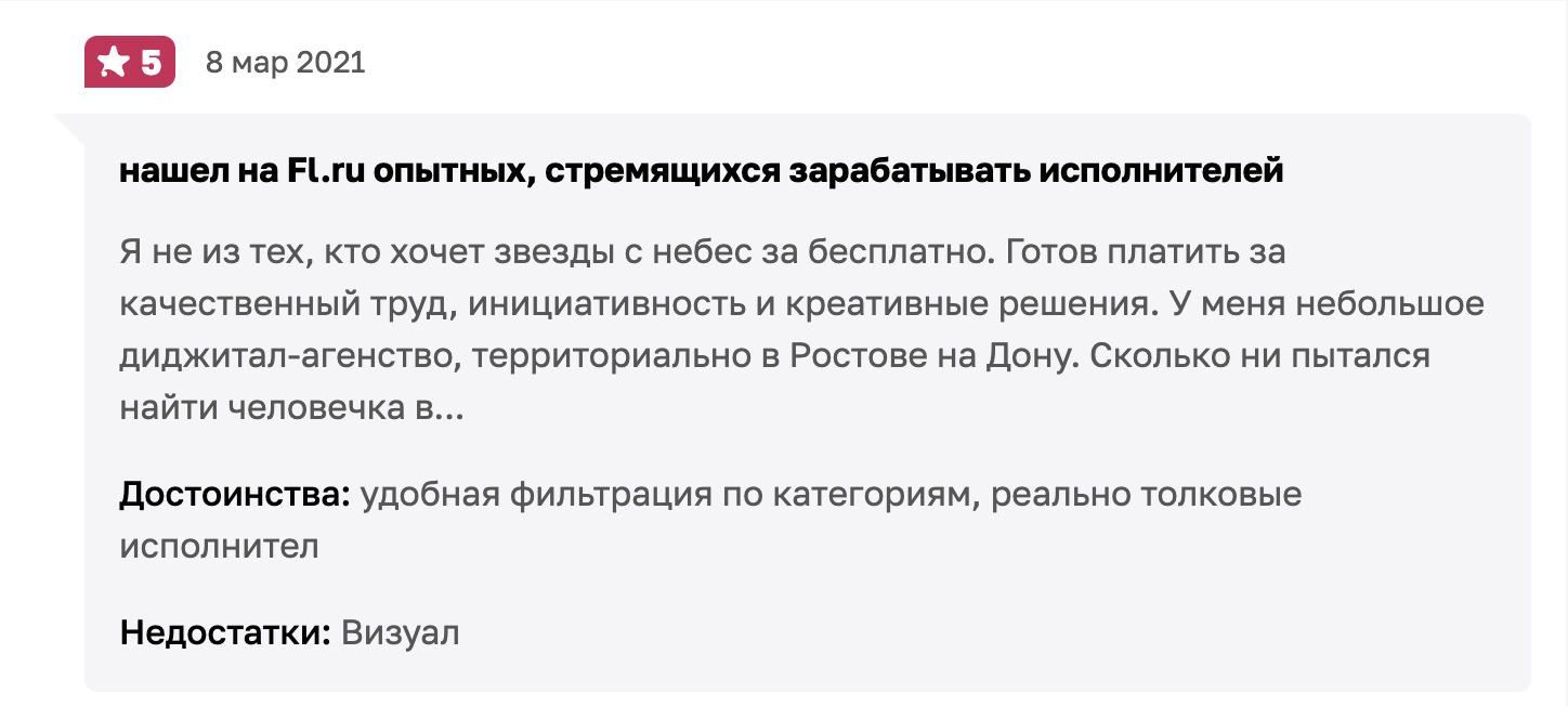 На многих сайтах встречаются жалобы и резко негативные отзывы на жесткие условия и блокировки на бирже Фл ру. Встречаются и редкие хорошие упоминания с отзывами людей о фриланс работе без опытна на Fl ru. В них люди делятся крупными заказами и удобным сервисом поиска исполнителя.