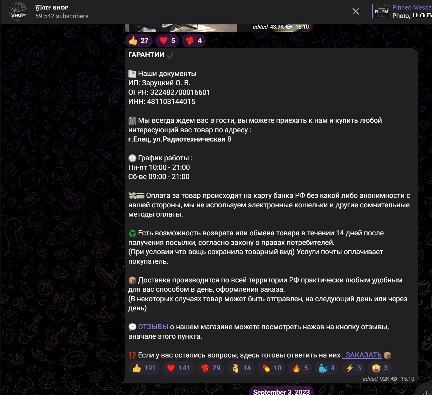 Канал создан в сентябре 2023 года, в первых же постах указаны реквизиты ИП Заруцкий О.В., дан адрес офиса в городе Елец. По нему действительно находятся три магазина одежды, но контакты у них отличаются, есть собственные ТГ группы с аудиторией менее 2000 человек. Никакого отношения к Flare Seller эти продавцы не имеют. Вероятно, данные компании используются без ведома владельца. Аудитория сообщества Flare Shop составляет 59,5 тысячи человек, однако посты читает от силы 4-4,5 тысяч подписчиков. Комментирование отключено, задать вопросы продавцу можно только в личной переписке. Для отзывов создан отдельный канал, на него подписано чуть больше 2 тысяч пользователей.