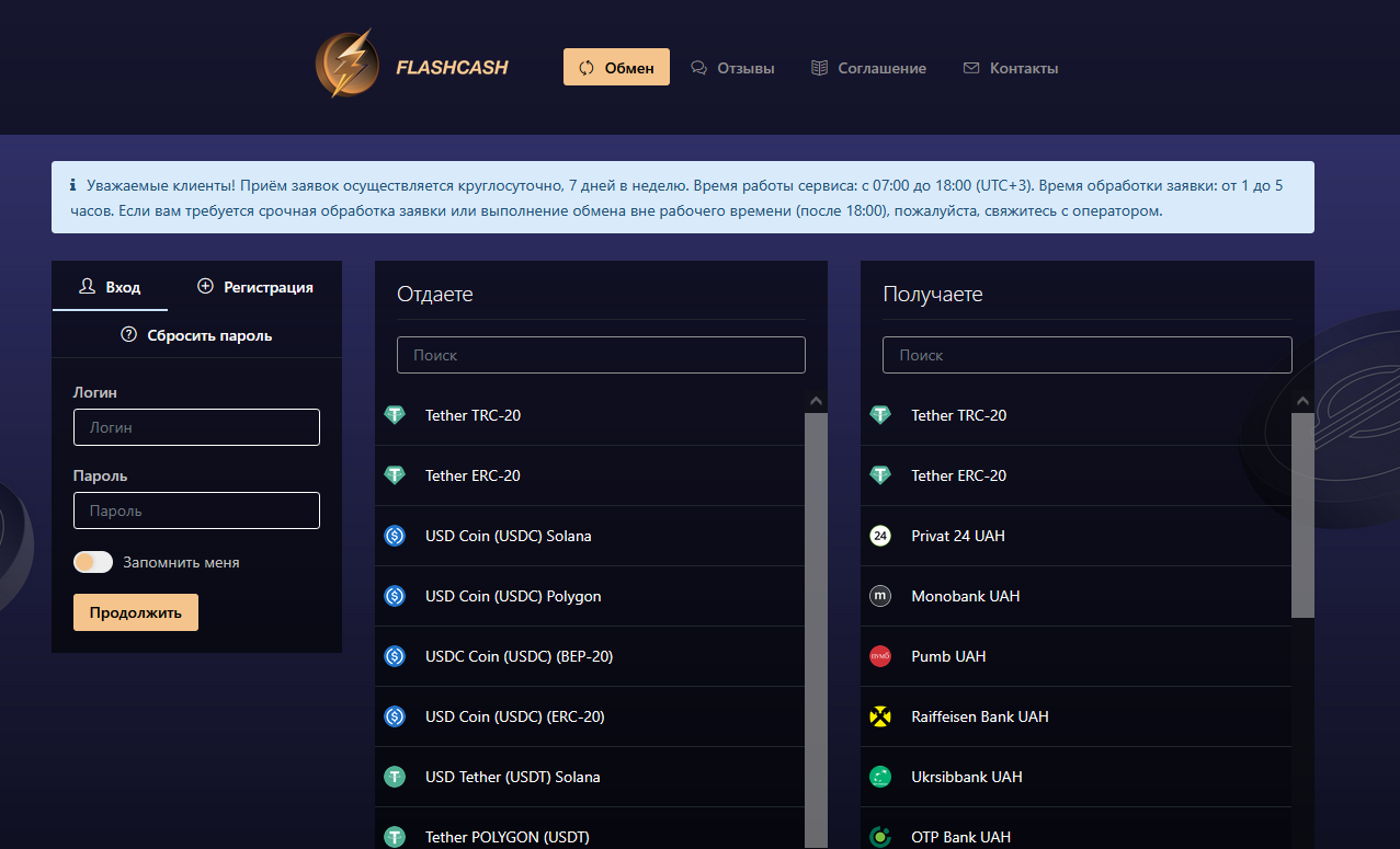 Обменный пункт работает через сайт flashcash top (мобильного приложения нет), предлагает хорошие курсы, транзакции с популярными криптовалютами. Есть возможность вывода средств на карты украинских банков (только в гривне) или переводы по IBAN. Полный перечень доступных валют указан на сайте.