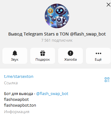 Для подключения возможности осуществления валютных транзакций с помощью «ФлэшСвэпБот» необходимо подписаться на канал Starsexton. В сообществе находится 7 561 участник.