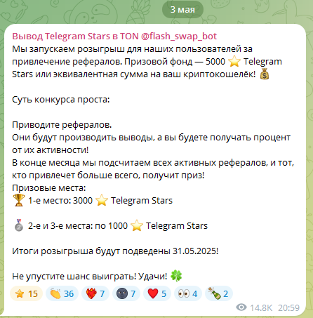 В группе «Вывод Telegram Stars в TON» публикуются отчеты о проведенных конвертационных операциях и проводятся розыгрыши призов. Подписчики могут получать на платформе тг-звездочки за привлечение новых юзеров на площадку. Пользователей мотивируют приглашать рефералов на проект, обещая начислять проценты от сумм переводов приглашенных участников. Тем гражданам, которые смогут привлечь на платформу больше всех новых активных юзеров, администрация вручит приз номиналом в 5 000 тг-звезд.