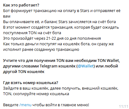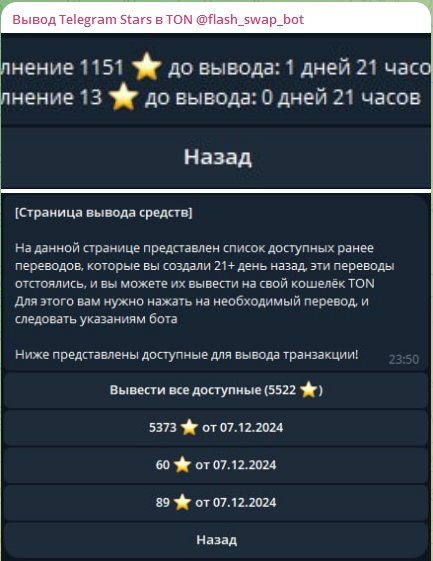 Разработчики приложения придумали схему, реализующую перевод звезд в криптовалюту «Тон» в течение минимум 21 дня. Сначала пользователи должны провести оплату заявки на обмен в Stars, дождаться поступления крипты на счет бота «ФлэшСвэп» и получить цифровую валюту на баланс своего кошелька. Юзерам необходимо предварительно привязать криптоваллет к системе конвертации.