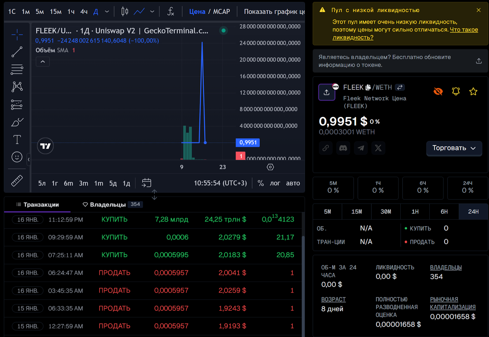 Информации о крипте экосистемы немного. Известно, что курс монеты Fleek Network на 18 января 2025-го составляет 0.99 долларов. Сам токен доступен для покупки только на Uniswap. Информации о добавлении Флик в листинг других биржевых платформ пока нет.