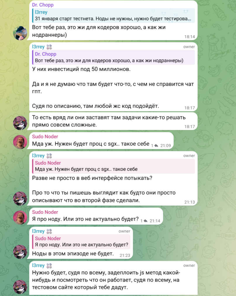 Несмотря на давнюю работу экосистемы, найти отзывы о Fleek Network Coin оказалось сложно. Больше всего мнений приводится в чате Telegram, где пользователи обсуждают проект, его возможности и перспективы. Правда, последняя запись сделана еще 14 февраля 2024 года. Такая особенность является одним из признаков заброшенности платформы.