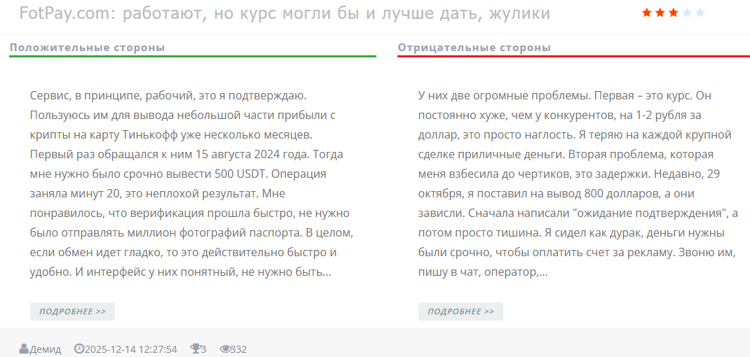 Мы выяснили, что Fotpay позиционирует себя как онлайн-сервис для обмена и переводов. Транзакции проводятся между электронными кошельками, криптовалютами и банковскими картами. Однако в начале января 2026-го этот обменник был недоступен. Приведем положительные и отрицательные его стороны по мнению пользователей.