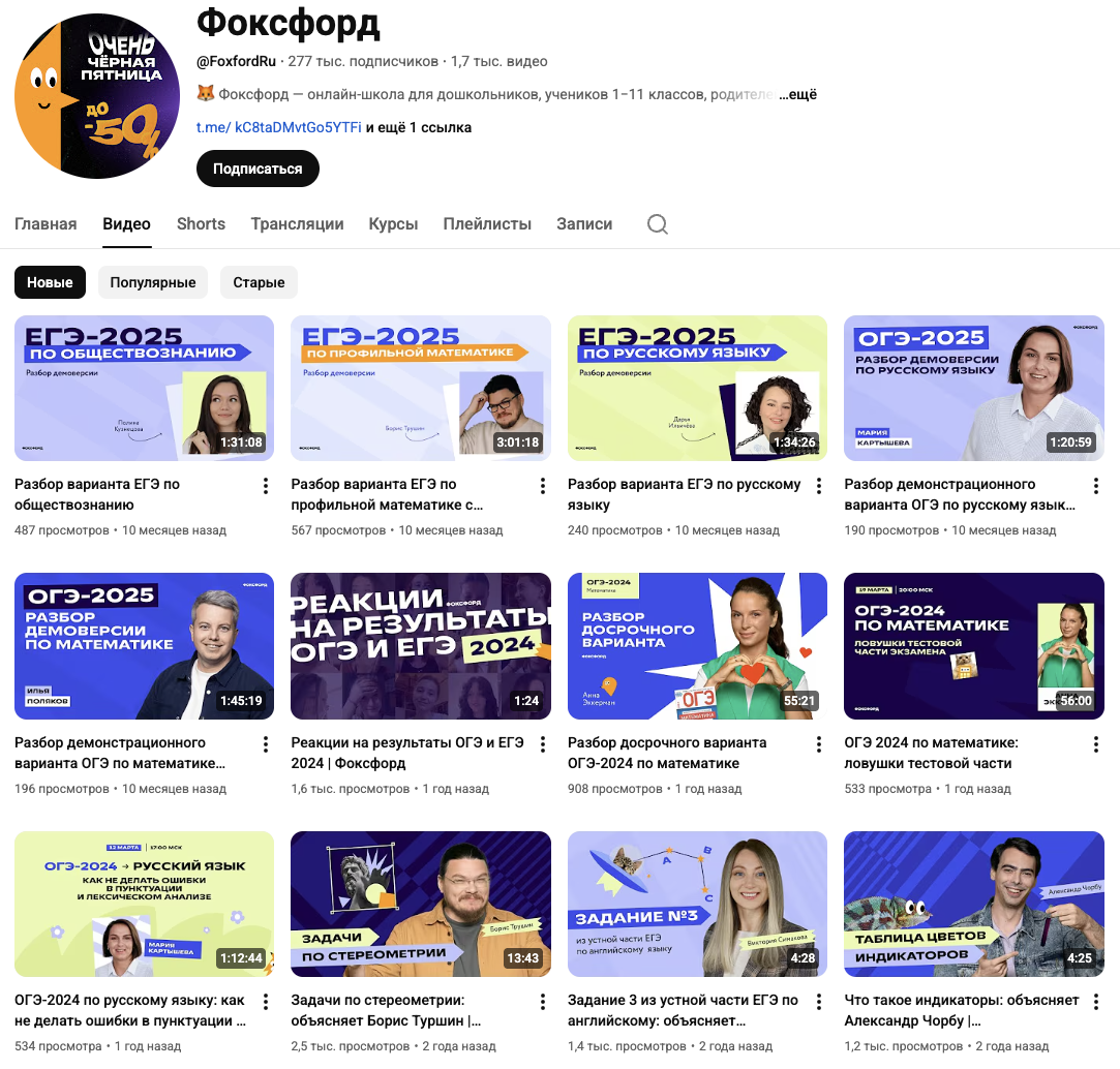 На ютуб-канал «ФоксФорд», который расположен по адресу FoxfordRu, на 26 ноября 2025-го года, подписаны 277 тысяч пользователей. Последние ролики на него были выложены более десяти месяцев назад, а получили они по 250-1500 воспроизведений.