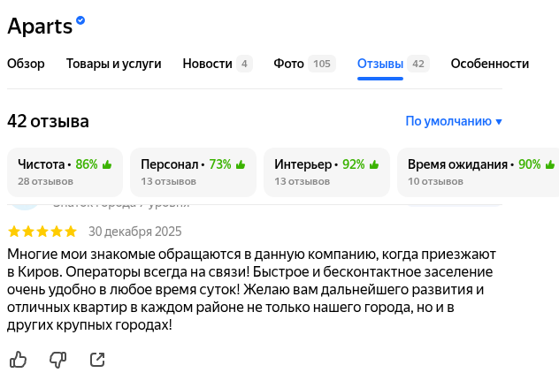 На Яндекс.Картах у компании масса положительных отзывов. Людям нравятся, что менеджеры постоянно на связи, реально помогают решать возникающие проблемы, что заселиться можно быстро и без проблем. Но если прочесть десяток этих отзывов, складывается впечатление, что они написаны по одному сценарию.