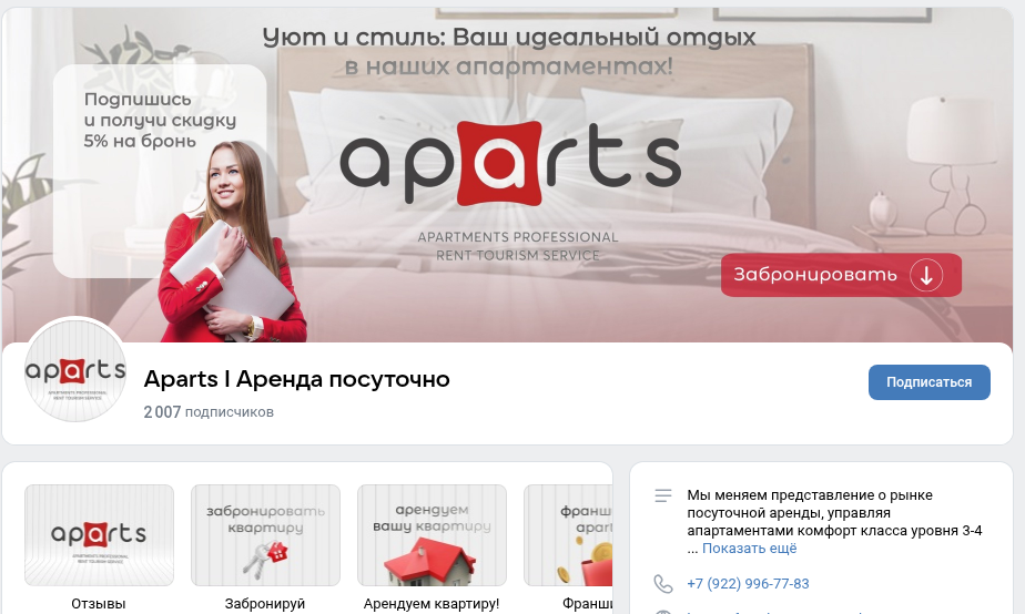Контент новостной, много рекламы услуг компании, есть прямые ссылки на бронирование недвижимости, франшизу. Также есть развлекательные посты для разбавления ленты.