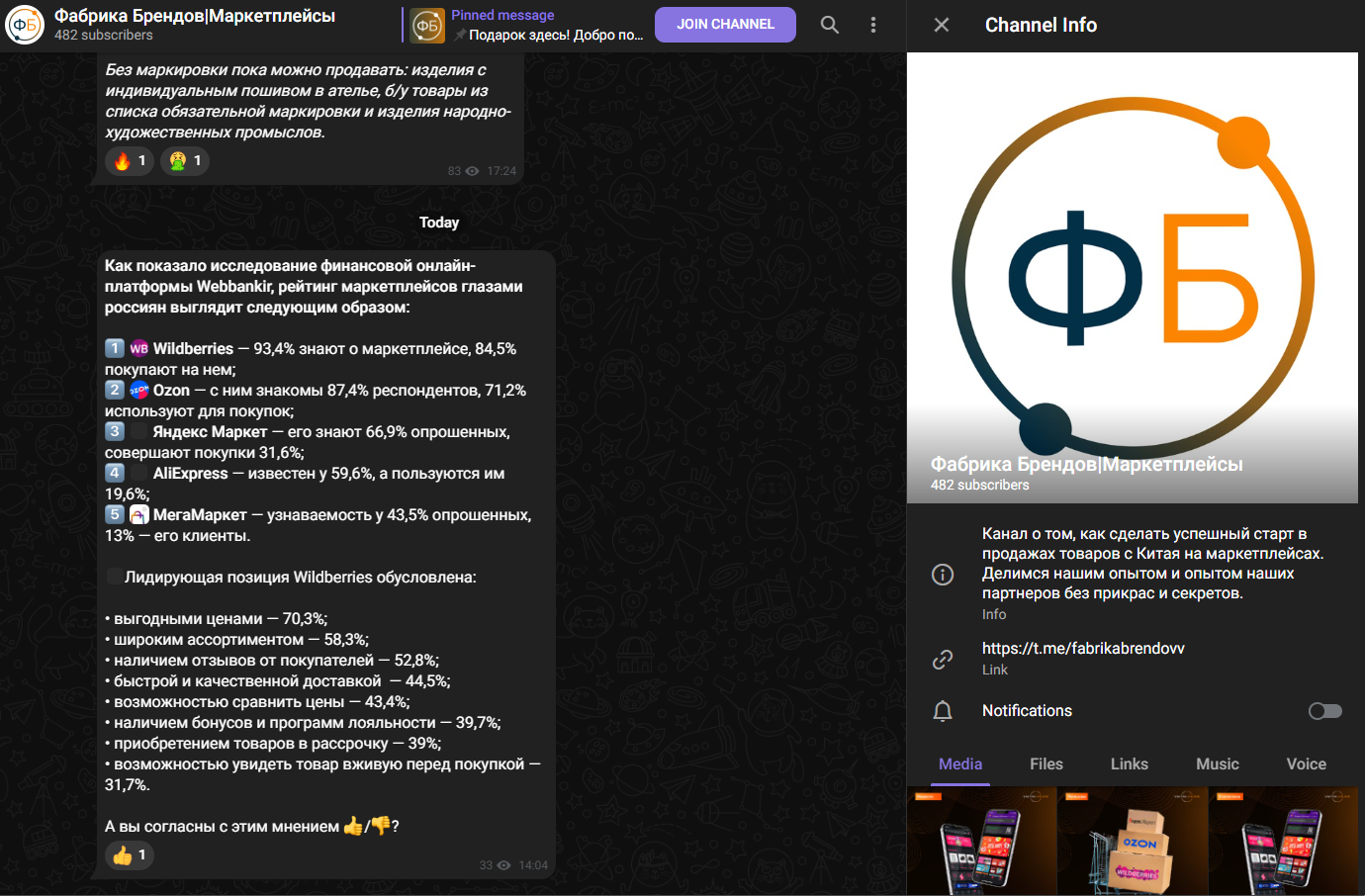 Второй странный момент — популярность бренда. Компания заявляет, что у них больше 30 партнеров. Но их официальный Telegram-канала Фабрика Брендов|Маркетплейсы (@fabrikabrendovv) собрал чуть меньше 500 подписчиков. Да и вопрос, как может компания с очень посредственными показателями в медиа что-то говорить о продвижении клиентских товаров.