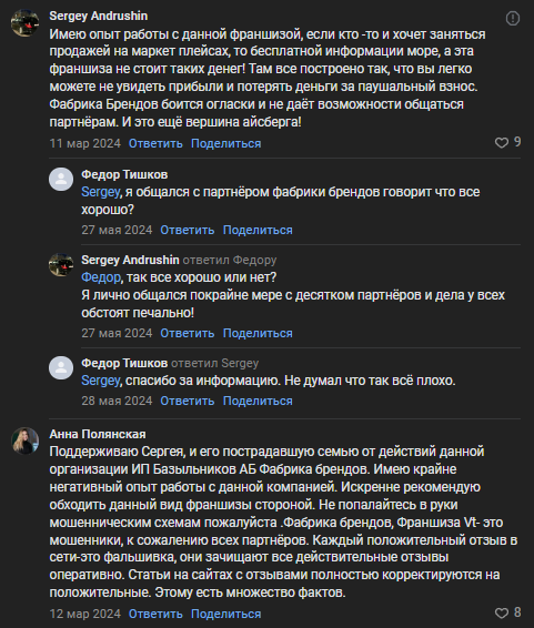 Сергей поднял очень важную тему. Основатели Фабрики Брендов не дают общаться партнерам. Никто не дает контакты коллег. Это показывает, что основатели проекта пытаются скрыть реальный результат работы.
