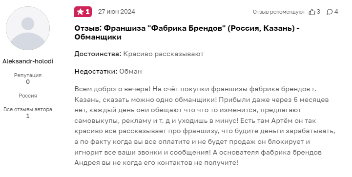Фабрика Брендов — никакая не франшиза. Это просто проект, который помогает выбрать товар на маркетплейсе и начать его продавать. Подобных компаний очень много, и у них цены намного ниже. На Фабрику Брендов жалуются клиенты, а некоторые даже грозятся пойти в суд.