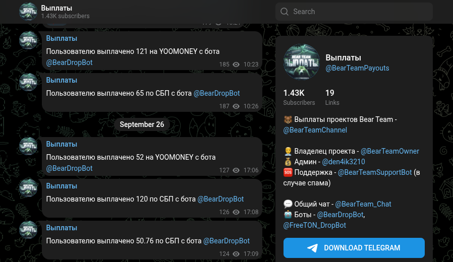 Владельцем проекта обозначен некий BearTeamOwner – абсолютный аноним. Выплаты админы показывают в ТГ-канале BearTeamPayouts, а «отзывы» собраны, опять же, в Телеграмм-группе BearTeamReviews.