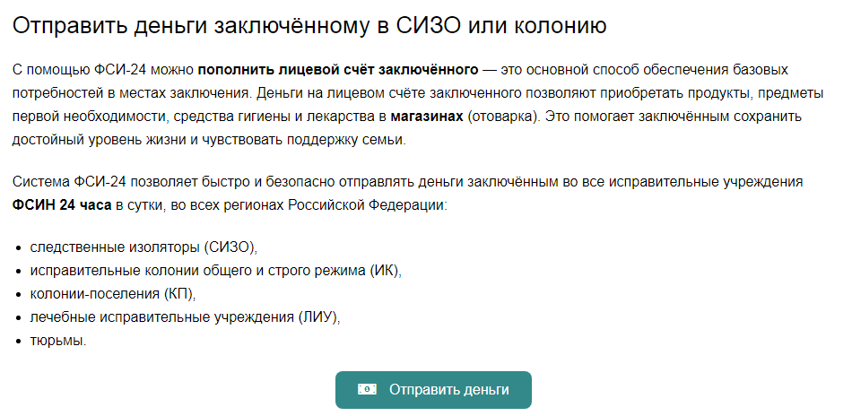 На официальном сайте рассказывается, что платформа принимает переводы от родственников людей, находящихся в местах лишения свободы. Система перечисляет принятые платежи на счета заключенных в СИЗО, КП, ИК, стандартные тюрьмы,