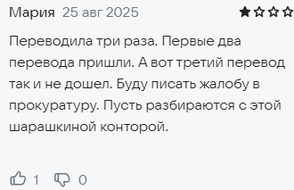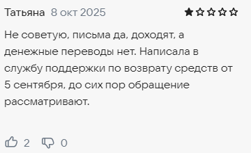 В комментариях клиенты рассказывают, что письма, отправленные через систему доходят, а переводы нет. Автор такого отзыва утверждает, что написал в службу поддержки, но заявку до сих пор рассматривают.