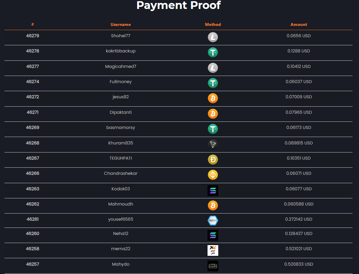 Внизу страницы, чтобы подтвердить платежеспособность ресурса, разместили историю выплат пользователей. Но тут тоже есть несколькро проблем. Во-первых, суммы в основном здесь очень небольшие, а узнать, сколько времени потратили на их заработок, нельзя. Во-вторых, даже это может быть фейком. Подобные истории легко могут генерироваться автоматически и ничего не доказывают, написать тут можно что угодно.