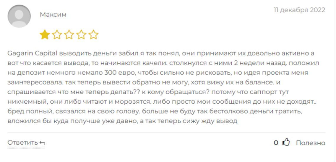 Отрицательные отзывы являются еще одним доказательством того, что Gagarin capital не самый надежный проект.