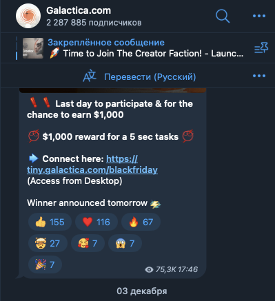 На телеграм-канал Galactica com, galacticanetwork, на 9 декабря 2024-го года, подписано около 2,3 миллионов пользователей. Публикации просматривают в среднем 60-90 тысяч раз.