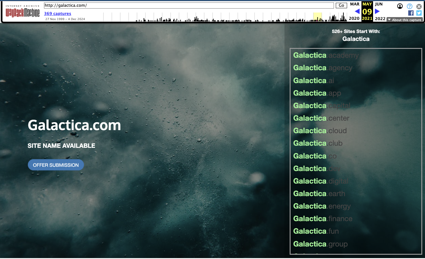 Также мы запросили снимки ресурса из WayBackMachine. Выяснили, что еще в мае 2021-го года домен galactica com находился на продаже. Непосредственно сайт блокчейна Galactica по нему появился в 2022-м.