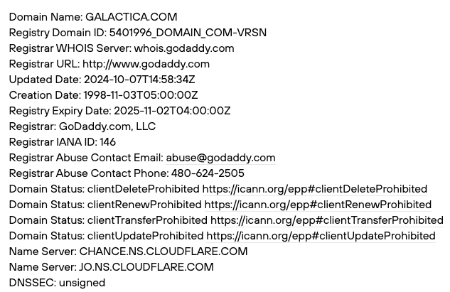 Чтобы дополнительно убедиться в том, что crypto-платформа Galactica существует продолжительное время, мы запросили данные ее доменного имени из сервиса Whois. Выяснили, что этот домен был делегирован еще в 1998-м году.