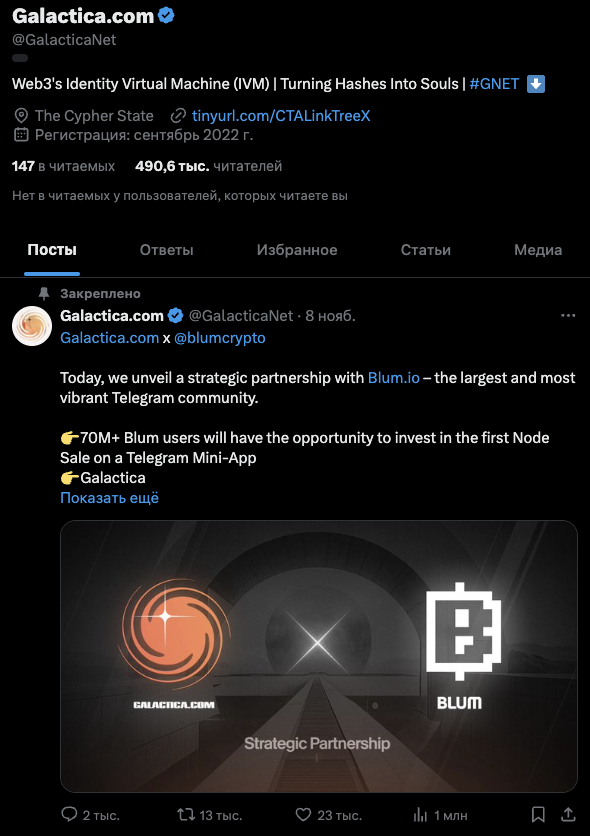 На страницу Galacticanet в Twitter подписано около 490 тысяч читателей. Выложенный 8 ноября 2024-го года и закрепленный пост получил около миллиона показов.