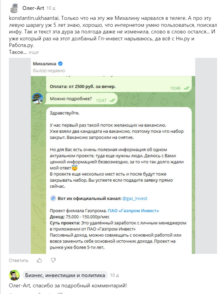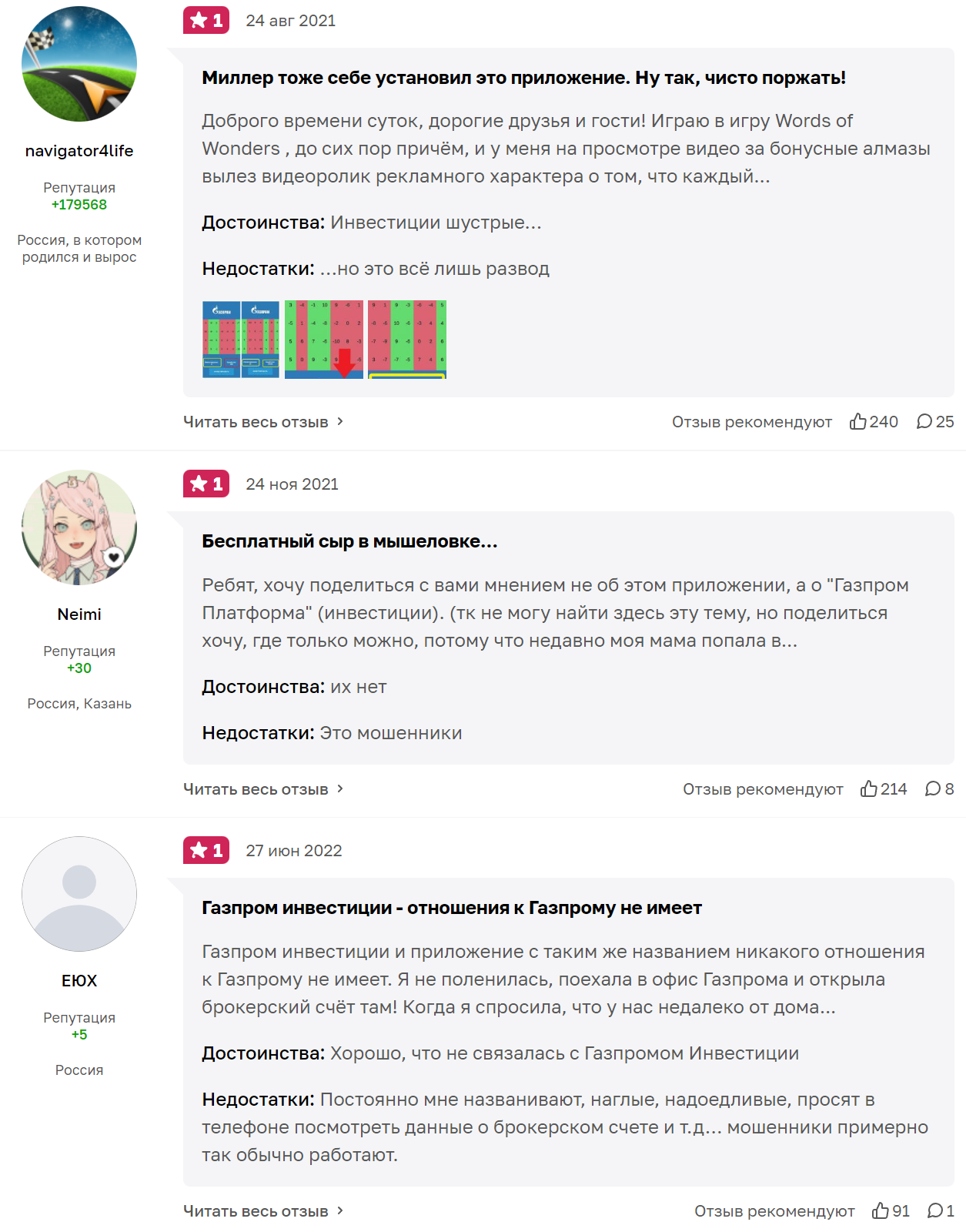 • множество негативных реальных отзывов о платформе Газпром инвест и заработке в Телеграм;