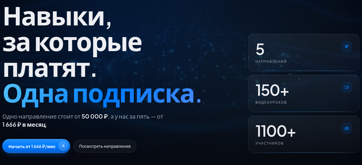 Платформа AI Empire включает пять направлений обучения под одной подпиской. Автор указывает, что каждый отдельный блок на рынке стоил бы от 50 до 70 тысяч рублей, а в AI Empire все пять — от 1 666 рублей в месяц. Подход к упаковке стандартный для онлайн-подписок в инфобизнесе.