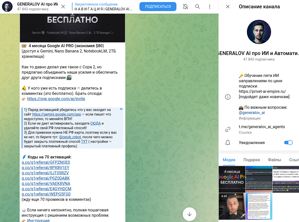 Работает по ссылке @generalov_ai_agents и преподносится как бесплатный источник по автоматизации и ИИ-агентам для бизнеса. Есть также закрытый чат для участников. Контент ориентирован на практику: