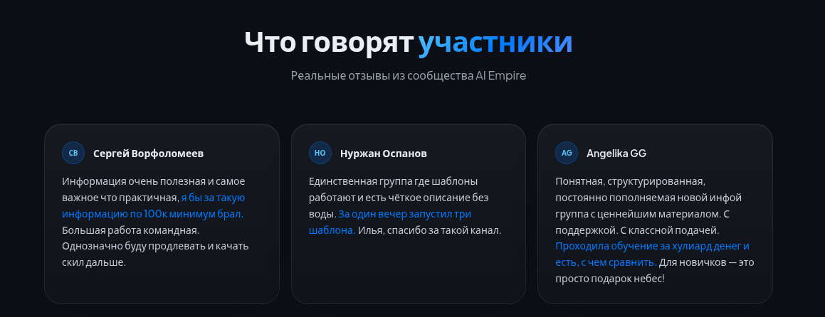 На сайте privet-ai-empire ru у Илья Генералов ИИ отзывы от участников, разумеется, только хорошие. Тональность однородная: хвалят структуру материала, живых кураторов, практическую направленность и доступность цены. Один из участников благодарит Илью за «такой канал», другой пишет, что «за такую информацию брал бы минимум 100 тысяч». Все отзывы короткие, без конкретных примеров заработка или реализованных проектов.