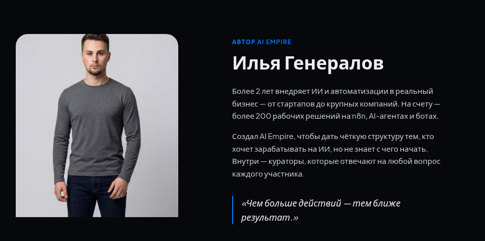 Илья Генералов описывает себя как практика с более чем двумя годами опыта внедрения ИИ и автоматизаций в бизнес. На его счету якобы более 200 рабочих решений на n8n, AI-агентах и ботах. Проверить этот трек независимым путем нет возможности — открытого портфолио с реальными кейсами и названиями компаний на сайте нет. Все на словах.