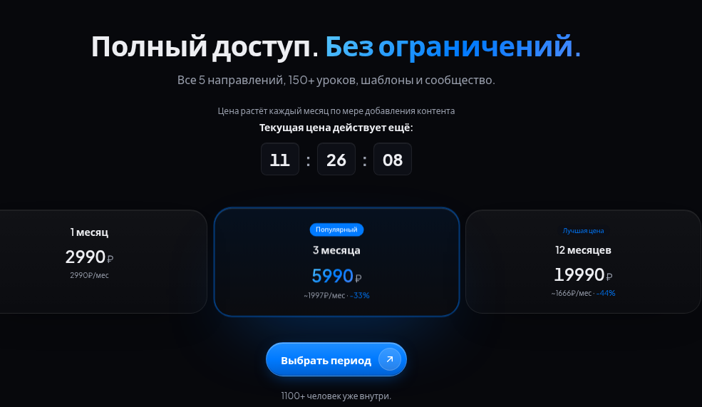 Адекватная образовательная платформа не строит барьеры на выход. На сайте также размещен таймер обратного отсчета с указанием, что «цена растет каждый месяц» — дешевый прием создания искусственного дефицита.