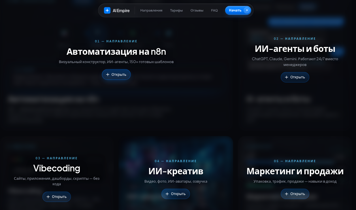 2. AI Empire — подписка с пятью направлениями: n8n, ИИ-агенты, vibecoding, ИИ-креатив, маркетинг; цена от 1 666 рублей в месяц.