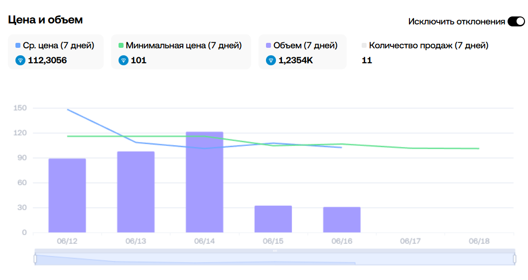 Минимальная цена за одну штуку составляет: 101 TON, а средняя цена за семидневку равняется: 112,3. Недельный объём торгов небольшой: 1,2. Суммарное количество: 30,96 тысяч. Отдельные экземпляры могут стоить от 2 до 9 тысяч токенов TON.