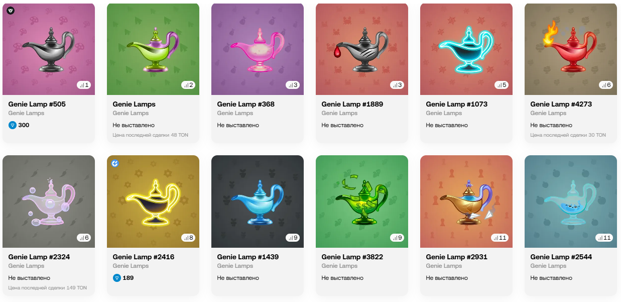 Genie Lamp – NFT Telegram коллекция, доступная пользователям, как подарок от приятелей, случайных юзеров или выигрыш в конкурсе. Помимо прочего, она свободно доступна для покупки или продажи на маркетплейсах. Пак представлен в виде ламп с джином внутри, имеющий разнообразные скины и схемы оформления.