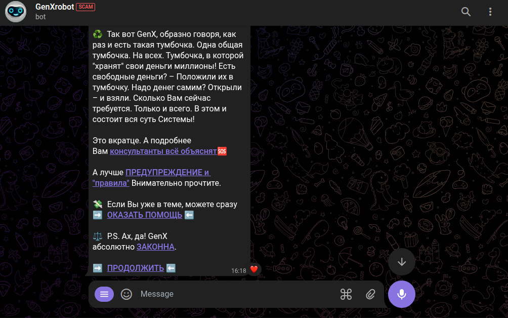 GenxAutoBot — абсолютно бесполезный проект, который лучше игнорировать. Данил Юсупов под видом взаимопомощи скрывает финансовую пирамиду. Более того, вся деятельность эксперта построена как раз на продвижении скам проектов по типу GenxRobot: