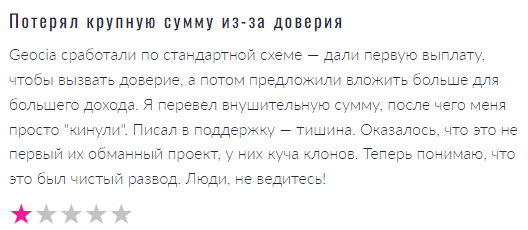 - Репутационный след. На независимых ресурсах проект подозревают в мошенничестве. Мы нашли 10 отзывов о Geocia. Все они негативные.