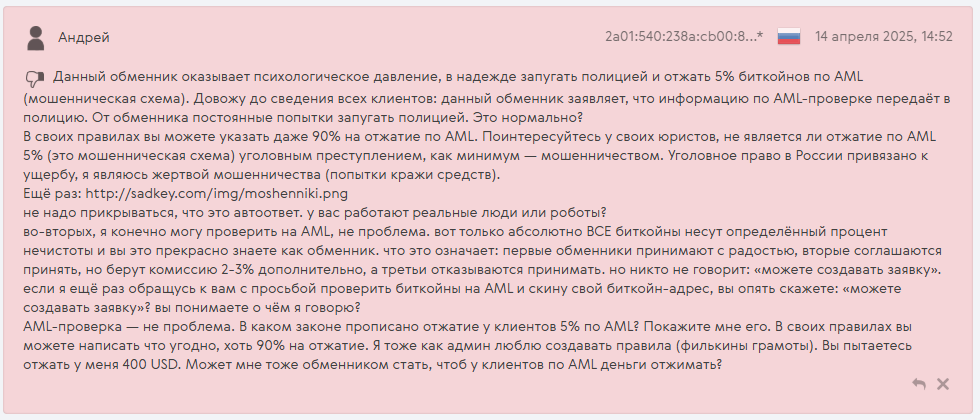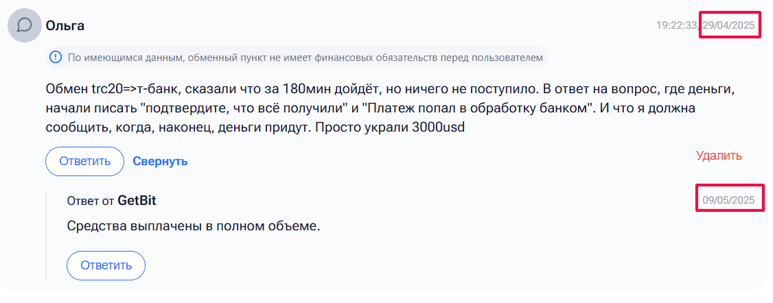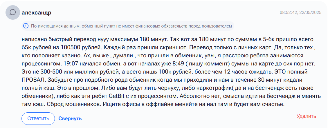 Отзывы о Getbit exchange на мониторингах преимущественно положительные, но в последнее время стало появляться много негатива. Основная причина — выплата крупных сумм частями в течение нескольких дней, при этом клиент после каждого перевода должен прислать скриншот о получении денег. Это уже даже не 240 минут, как заявлено в правилах. Например, в одном из отзывов пишут, что обменник не произвел выплат на сумму 3000 долларов. Ответ организации пришел спустя 10 дней, то есть перевод осуществили спустя полторы недели, при этом не выходили с клиентом на связь. Еще одна распространенная претензия — AML проверка, в рамках которой с клиента удерживают от 5% криптовалюты. Это огромный процент, такого нет у конкурентов. Ряд пользователей считает, что Getbit превратился в скам.