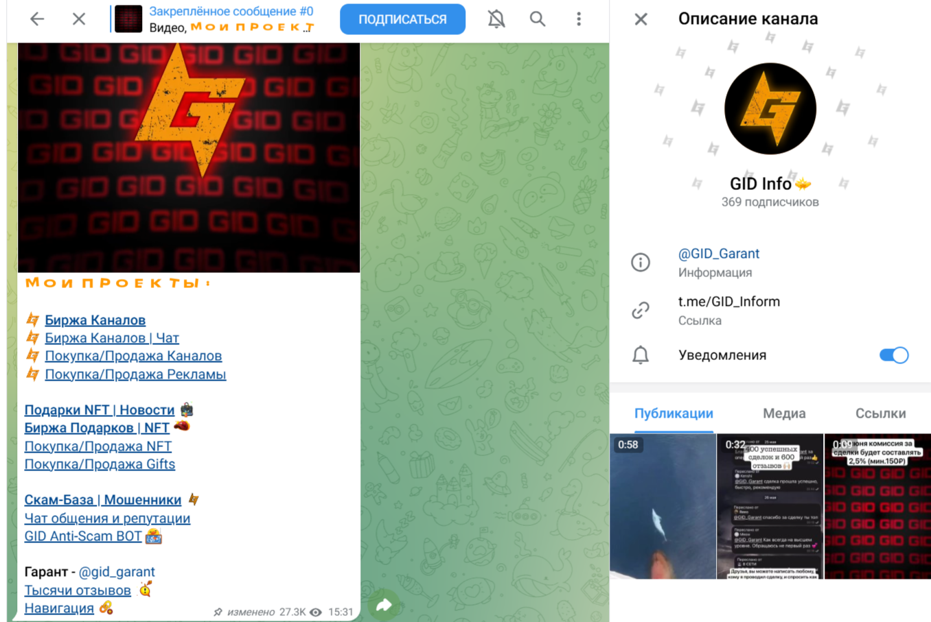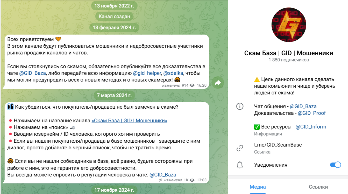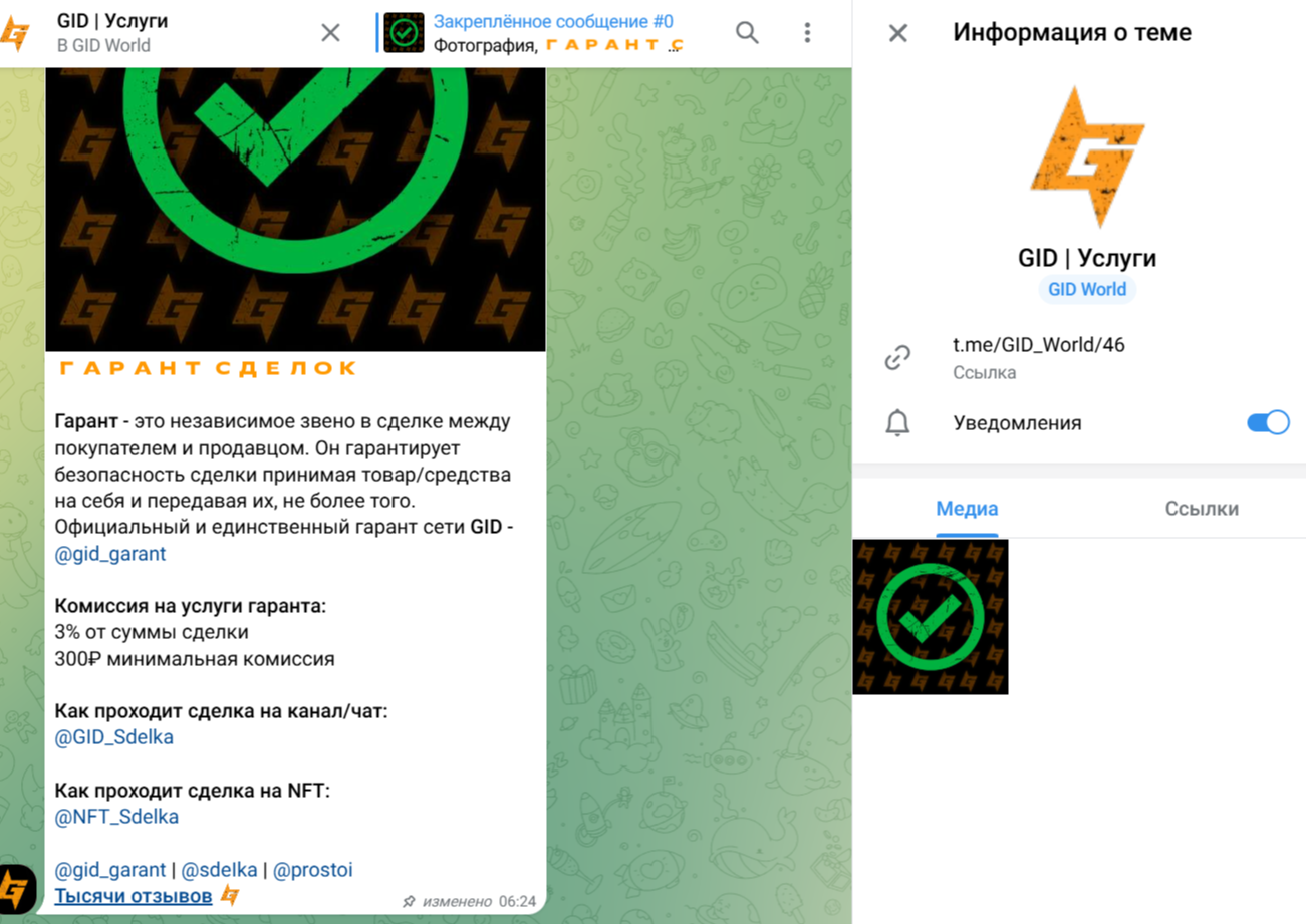 Кроме торговых площадок, гарант предлагает целевой аудитории бота для пиара, бота для защиты. К услугам подписчиков Gid Garant скам-база. Этот канал появился в мессенджере 13 ноября 2022 года. Первые публикации о мошенниках и недобросовестных участниках рынка здесь появились 13 февраля 2024 года. Проект имеет 1 850 подписчиков.