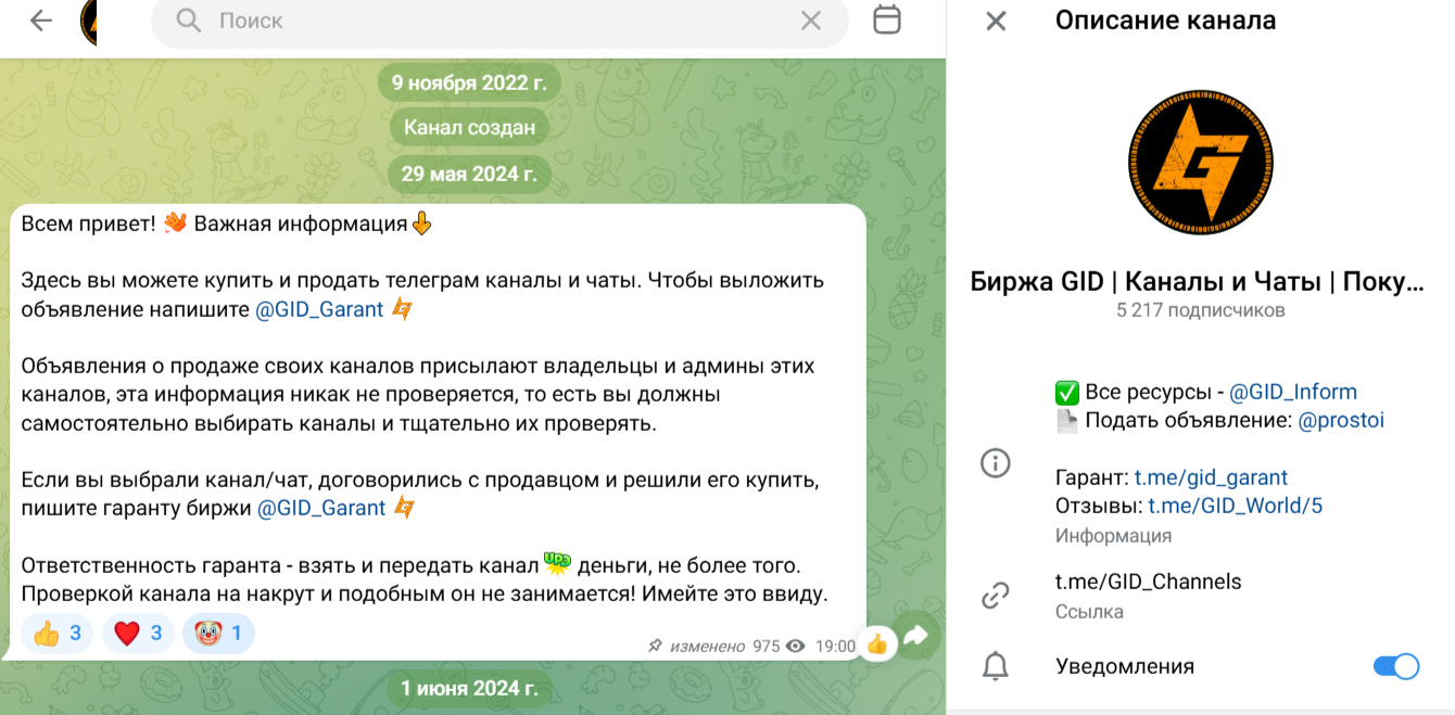 Для приобретения или продажи бизнеса в Телеграм подписчики гаранта также могут воспользоваться услугами биржи. На торговую платформу подписано 5 200+ пользователей. Канал был создан 9 ноября 2022 года, но начал активную деятельность лишь 29 мая 2024 года.