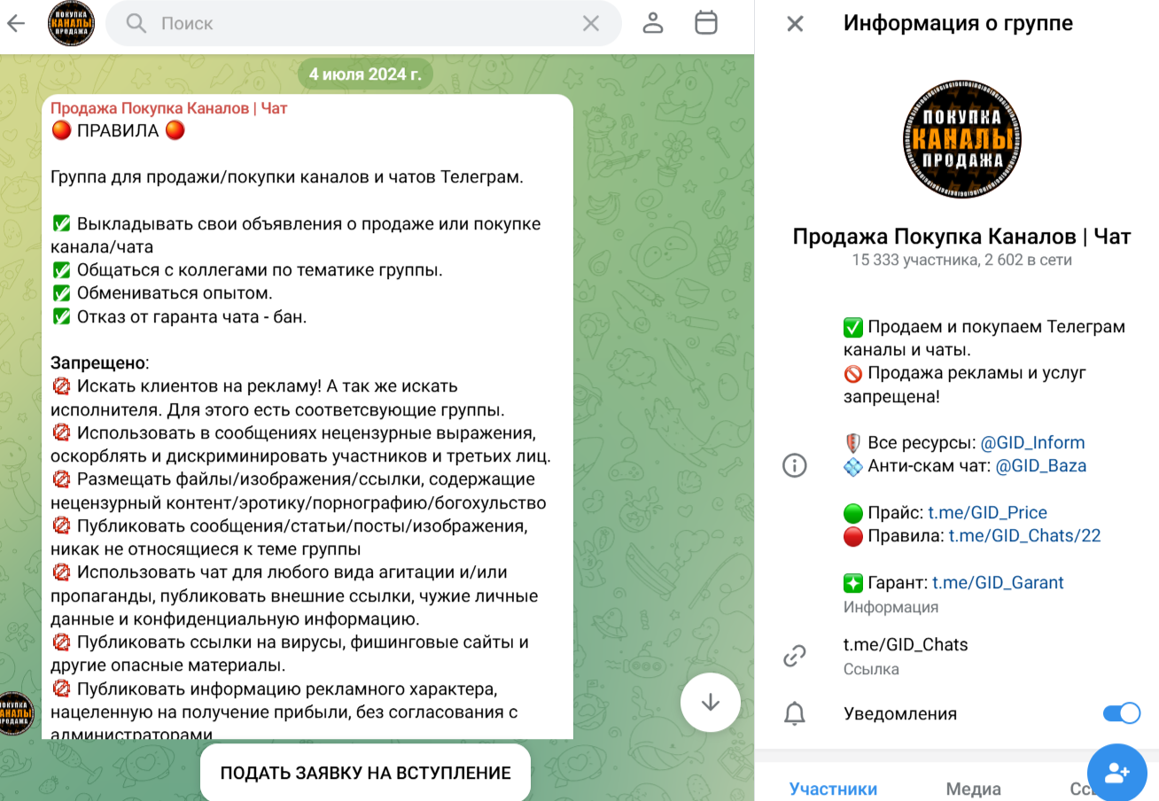 Одним из самых популярных проектов гаранта можно назвать «Продажа Покупка Каналов Чат». Канал был создан 4 июля 2024 года. На него подписано 15 000+ пользователей. Ресурс представляет собой доску объявлений о купле-продаже каналов.