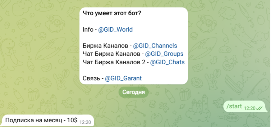 На бесплатной основе собственник ресурса «Гид Гарант» позволяет подписчикам размещать на своих дополнительных каналах объявления о купле-продаже. Бесплатно пользователи могут получить доступ к боту Anti-Scam. Услуги GID Subscribe bot предоставляются платно. За месяц использования программы, которая умеет пиарить, нужно заплатить 10 долларов.