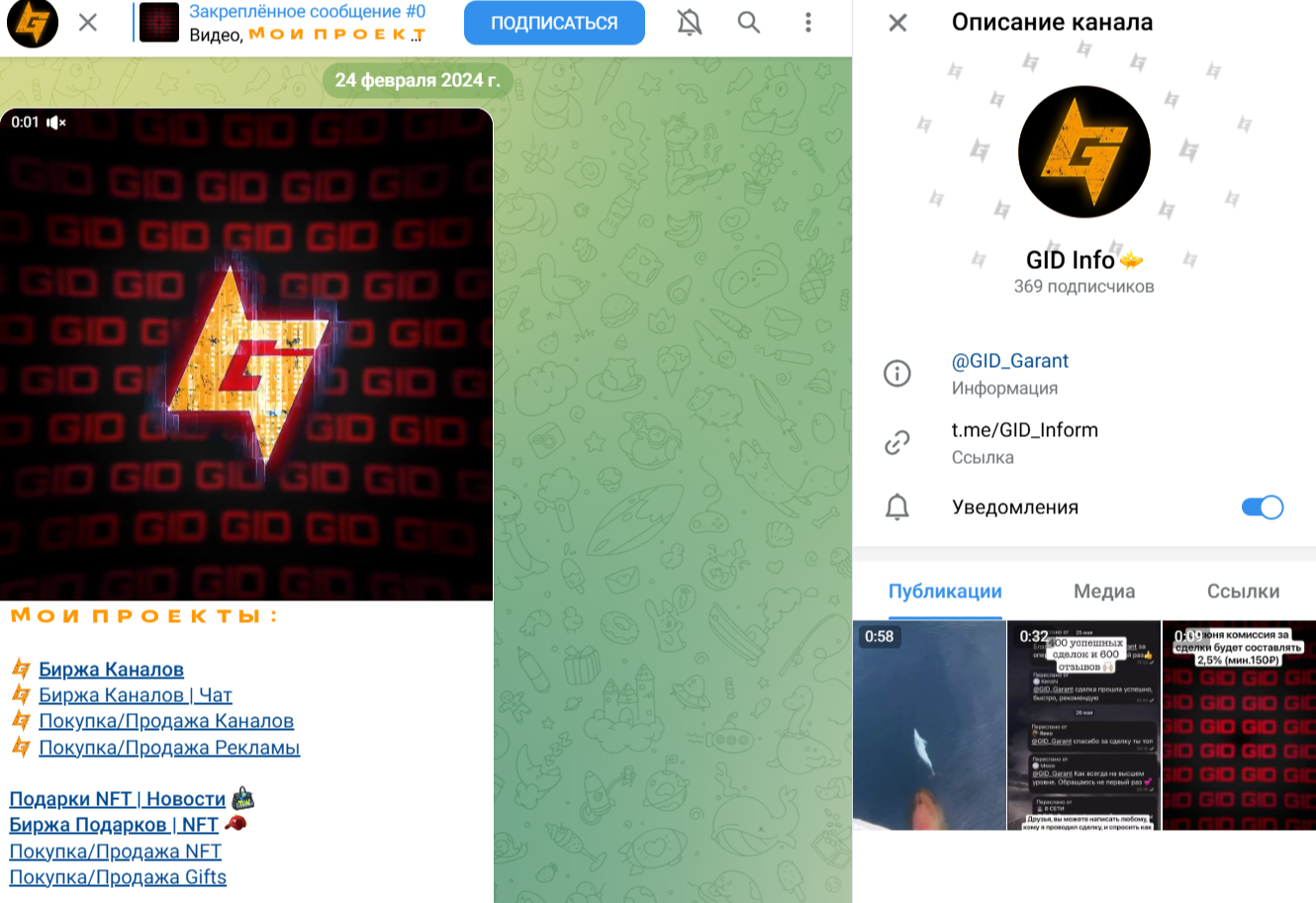 Создатель обширной инфраструктуры в Телеграм предлагает подписчикам целый ряд проектов: GID ScamBase, GID Baza, GID Price, GID Groups и т. д. Канал, связывающий всю сеть, GID Inform был зарегистрирован 24 февраля 2024 года. Он имеет 369 подписчиков. Основной задачей этого проекта является навигация пользователей.