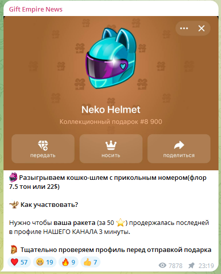 Для убедительности мошенники создали телеграм-канал GiftEmpireLogs, в котором публикуются имена счастливчиков, выигравших призы. Однако проверить, кто эти люди и получили ли они приз на самом деле, невозможно.В инфраструктуру проекта входит также канал с новостями GiftEmpireNews. В нем проводят дополнительные розыгрыши. Например, чтобы выиграть кошко-шлем, нужно пополнить счет на $22 или 7,5 TON. Все это выглядит очень сомнительно и напоминает развод.
