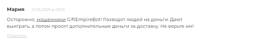 Что вы думаете о мошенническом боте с подарками Gift Empire, поделитесь своим мнением в комментариях. Чтобы лучше ориентироваться в мошеннических схемах и не попасться на удочку аферистов, читайте другие обзоры на нашем сайте.