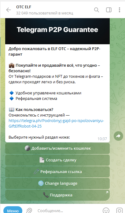 Otc Gift elf robot telegram bot использует несколько основных методов для обмана пользователей. Он обещает выгодные условия P2P обмена, покупки и продажи NFT, что привлекает внимание доверчивых пользователей. Обменник в ТГ «Отс Елф бот» создает ложное ощущение безопасности, утверждая, что обмен происходит через проверенные механизмы.