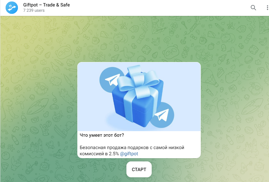 Giftpot bot – это Telegram-бот, где можно продавать подарки. Проект создан пользователем @giftpo. Он утверждает, что пользователям гарантирована безопасная продажа подарков с комиссией 2.5%.