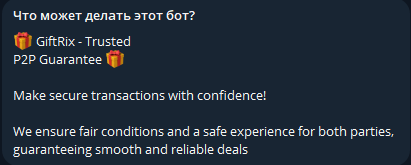 «Гифтрикс» позиционирует себя именно как такой сервис. В описании бота написано про безопасные транзакции и надежный опыт. Разработчики обещают справедливые условия. Но проверить эти заявления на практике не получилось.